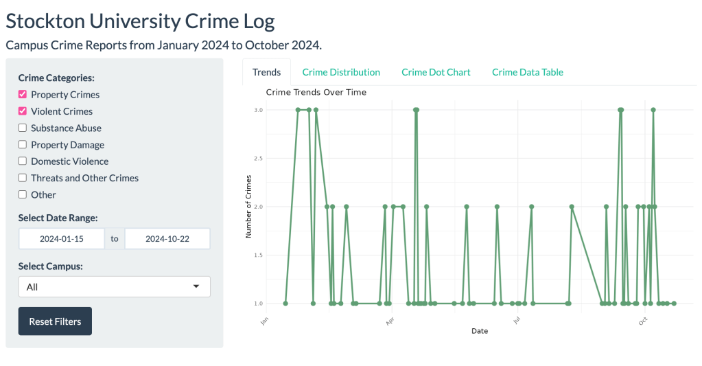 This project visualizes Stockton University’s 2024 crime data, focusing on campus safety trends through an interactive Shiny app. The app allows users to filter crime data by category, timeframe, and campus, offering valuable insights into patterns of criminal activity on campus. Key visualizations include a time series chart, histogram, and dot plot, enabling users to track crime trends over time and by location.